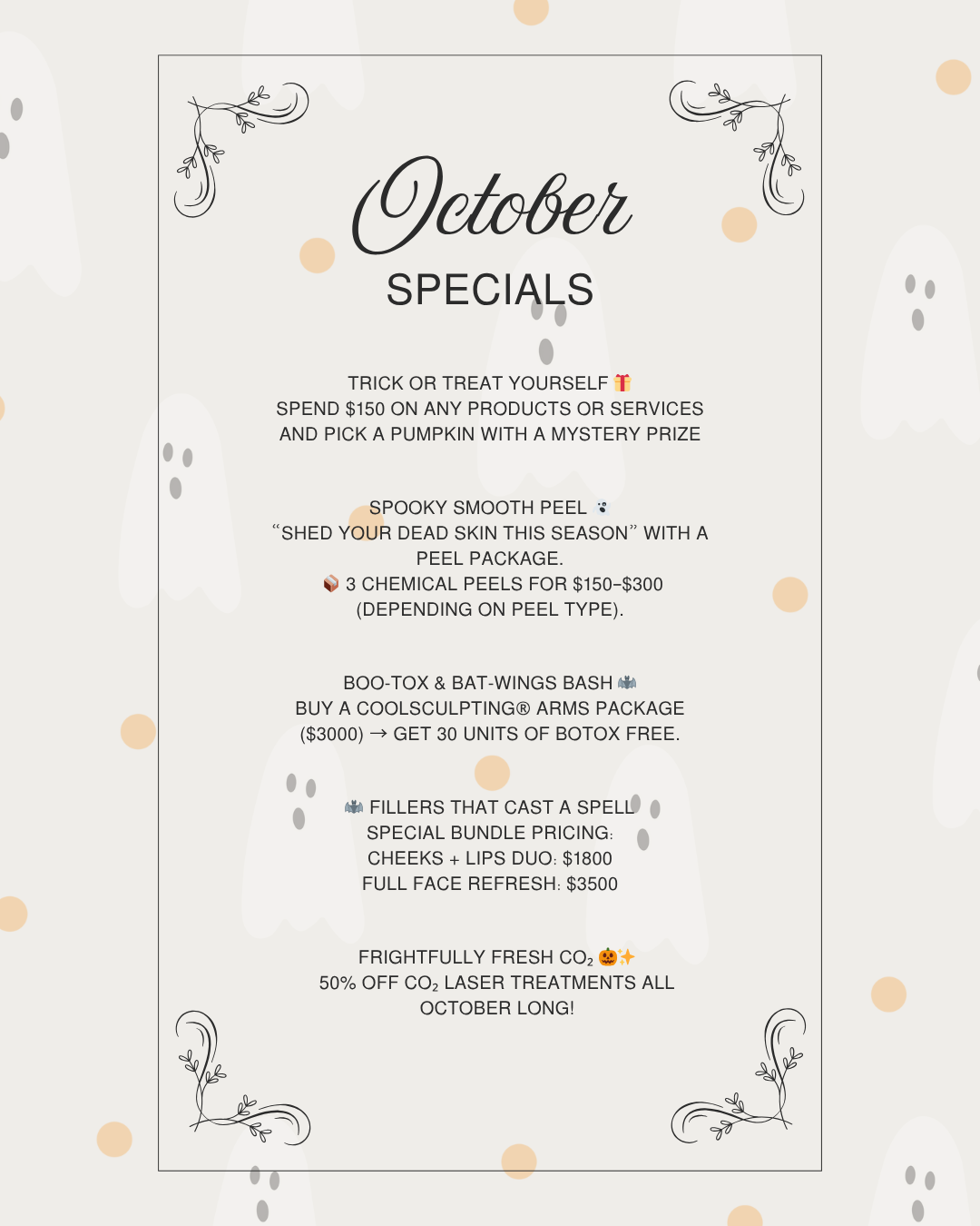 Spend $150 on any products or services and pick a pumpkin with a mystery prize inside (gift cards, skincare samples, % off).
